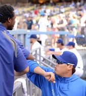 2013.08.12 10: 10장난치는 류현진,'맷 켐프, 삐진 건 아니지?'
