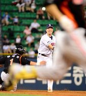 2013.08.14 19: 582루 도루 성공하는 배영섭, '공이 어디로 오는거야'