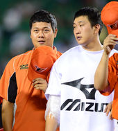2013.08.16 21: 58유창식-김혁민,'오늘 고춧가루 제대로 뿌렸지?'