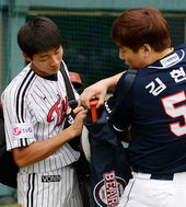 2013.09.11 18: 14김현수,'김용의에게 배트 선물'
