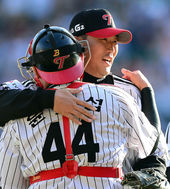 2013.10.05 17: 21'은퇴' 최동수,'윤요섭과 뜨거운 포옹'