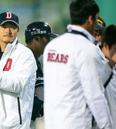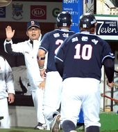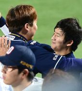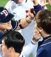 2013.10.24 20: 08김현수 볼 꼬집는 홍성흔, '예뻐 죽겠어~'