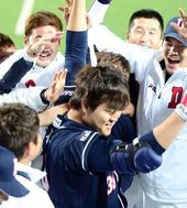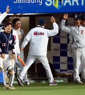 2013.10.25 23: 13두산 더그아웃, '오재일 만세!'