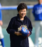 2013.10.27 14: 55박근혜 대통령 한국시리즈 시구,'야구 글러브 생소하네요'