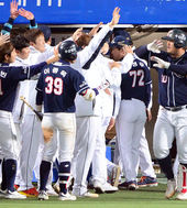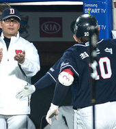 2013.10.31 19: 51환호하는 두산 더그아웃, '최준석 누가 말릴까~'
