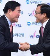 악수 나누는 최경환 WKBL 총재와 이순우 우리은행 은행장