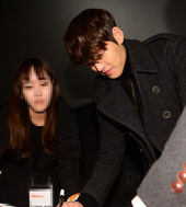 2013.11.28 20: 14티셔츠 선물에 사인하는 김우빈
