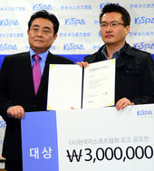 2014.01.25 17: 05구단기 수여 받은 이재명 성남시장과 신문선 대표이사