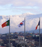 2014.02.02 18: 23눈 덮인 산을 배경으로 펄럭이는 소치 동계올림픽의 안내 깃발