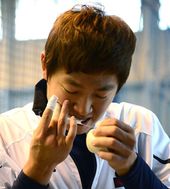 2014.02.07 17: 07정수빈,'테이핑에 가위는 필요없어~'