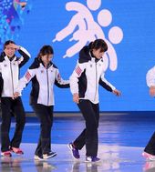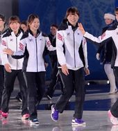 2014.02.19 01: 53한국 여자 쇼트트랙 계주 대표팀,'시상대로 사뿐사뿐 입장'