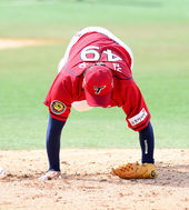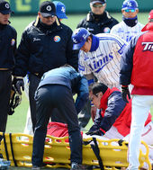 타구에 맞고 넘어지는 김진우