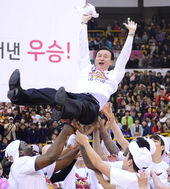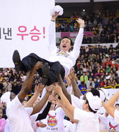 2014.03.09 16: 04헹가래 받는 김진 감독,'창단 첫 우승 이끌었다!'