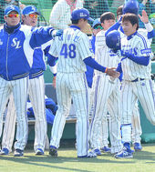 2014.03.22 14: 54삼성 더그아웃,'정형식 스리런포 축하해'