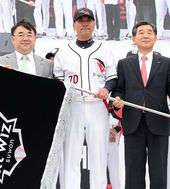 2014.03.29 12: 53구단기 건네받는 KT 조범현 감독-김영수 사장