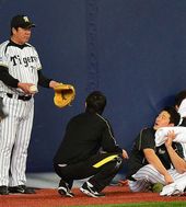 2014.04.03 16: 15한신 나카니시 투수코치와 대화 나누는 오승환
