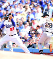 라미레스의 송구실책으로 포지를 진루시키는 류현진