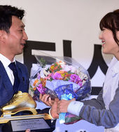 2014.04.07 12: 29은퇴 이규혁,'선-후배의 꽃다발 선물 받으며 미소'