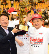 2014.04.10 21: 50우승 트로피 든 유재학 감독,'승리의 브이'