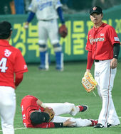 2014.04.12 19: 09무릎통증 박진만,'들것에 실려 교체'
