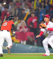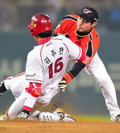 2014.04.15 20: 09협살걸린 정근우,'홈으로 갈까 3루로 갈까?'