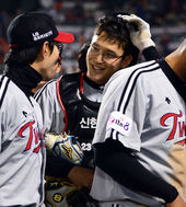 2014.04.19 20: 51끝내기 안타 고동진,'물벼락은 싫어'