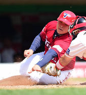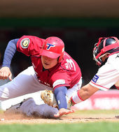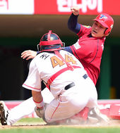 2014.04.20 14: 45김주형,'홈플레이트에 손을 뻗어 보지만'