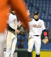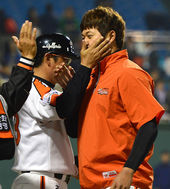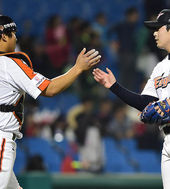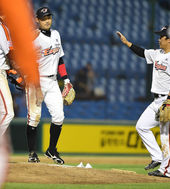 2014.04.24 21: 58경기 마무리지은 한화 최영환-엄태용 배터리