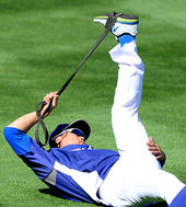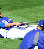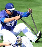2014.04.24 09: 04류현진, '누워서 스트레칭'