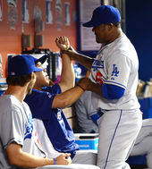 2014.05.04 09: 23유리베,'류현진 모자 잡고 댄스 타임!'