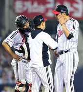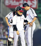 2014.05.13 20: 37마운드 방문한 양상문 감독,'우리 배터리를 믿어'
