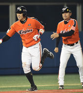 환호하는 한화 정범모,'짜릿하게 넘겼어요!'