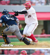 2014.05.31 20: 03[연속사진]홈 쇄도 나지완,'김태군의 다리에 걸려 아찔'