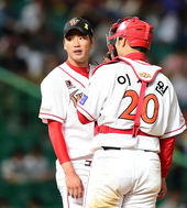2014.06.05 20: 21김광현-이재원,'침착하게 가자고'