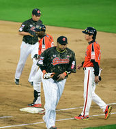 2014.06.05 19: 56채태인,'배영수 선배, 저 수비 괜찮았죠~'