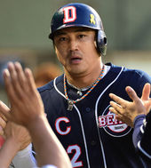 하이파이브 나누는 홍성흔,'따라잡을 수 있어'