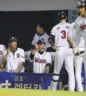 2014.06.18 22: 11'투런포' 칸투 맞이하는 두산 더그아웃,'역전으로 가자'