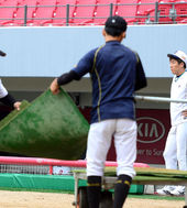 2014.07.03 17: 47부슬비에 그라운드 살피는 김현수