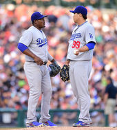 2014.07.09 09: 36마운드 방문한 유리베,'류현진 괜찮아'