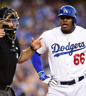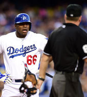 2014.07.13 12: 18항의하는 푸이그,'스트라이크존이 이상한데'