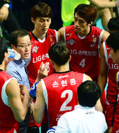 1세트 승리한 LIG,'미소 머금고'