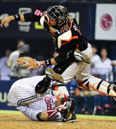 최경철 넘어지고, 장성우는 재빨리 송구하고