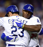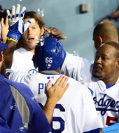 기뻐하는 다저스 선수들,'푸이그 솔로포 축하해'