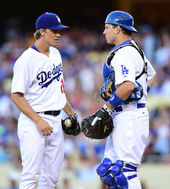 2014.08.05 12: 16그레인키-A.J 엘리스,'3타자 연속 안타 허용이야'