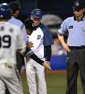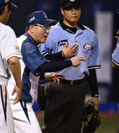 2014.08.07 21: 16판정 항의 김경문 감독,'공도 오기 전부터 막고 있었다고'