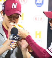 2014.08.14 22: 04통산 첫 승 김대우,'물세례 대신 바나나 먹어요'