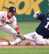 2014.08.20 18: 54오재원,'공이 먼저 도착했네'