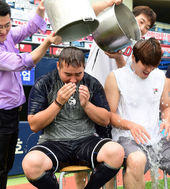 2014.08.24 17: 29'아이스버킷챌린지' 얼음물에 놀라는 유희관-김재호