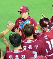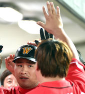 2014.08.30 20: 19김대우 호투에 하이파이브 나누는 넥센