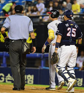 2014.09.04 19: 18니퍼트 공에 몸 맞은 정성훈,'나 뿔났어'